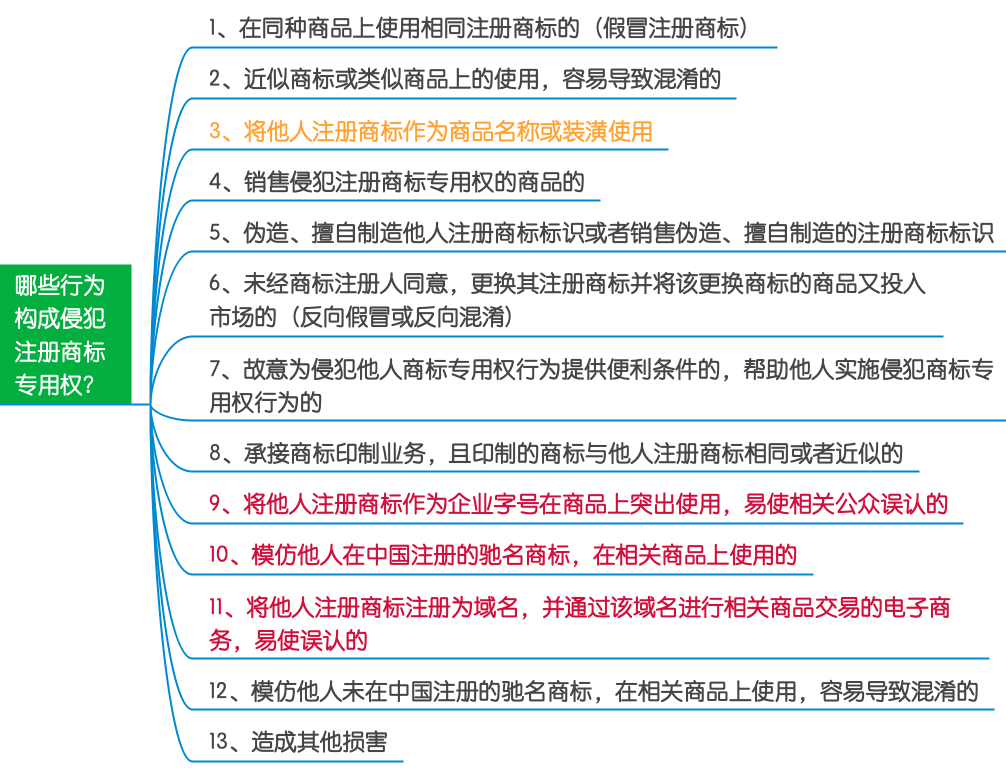 所谓“侵犯注册商标专用权”的行为,又称商标侵权行为,是指一切损害他人注册商标权益的行为。构成侵犯注册商标专用权,需要四个要件:一是客观性,即客观上存在损害他人注册商标权益的事实;二是违法性,即行为人的行为违反了法律规定,合法行为不构成侵犯注册商标专用权的行为;三是过错性,即行为人在实施违法行为时,主观上具有故意或者过失的过错;四是关联性,即损害事实与违法行为之间存在因果关系,损害事实是由违法行为造成的。一个行为,同时具备以上四个要件,即构成商标侵权行为。 我国《商标法》(2019修订)、《商标法实施条例》(2014修订)以及《最高人民法院关于审理商标民事纠纷案件适用法律若干问题的解释》(2020修正)、《商标印制管理办法》第十三条均规定了相应的侵害注册商标专用权的行为。其中《商标法》第五十七条规定了七种形式的侵权行为,可以归纳为:使用行为、销售行为、制造标识行为、反向假冒行为、帮助侵权行为、其他行为;《商标法实施条例》第七十五条具体列举提供的便利条件的形式、第七十六条列举将注册商标用作商品名称或装潢的侵权行为;《最高人民法院关于审理商标民事纠纷案件适用法律若干问题的解释》第一条规定了三种侵权行为,分别为将他人注册商标作为企业字号突出使用、模仿注册驰名商标作为商标使用、将他人注册商标注册为域名并进行电子商务;《商标印制管理办法》第十三条规定了承接商标印制业务,进一步细化帮助侵权形式;《最高人民法院关于审理商标民事纠纷案件适用法律若干问题的解释》第二条规定禁用未注册驰名商标,并对其保护。总计可归纳为如下侵害注册商标专用权的十三种情形: 01、未经商标注册人的许可,在同一种商品上使用与其注册商标相同的商标的 这就是通常所说的“假冒注册商标”行为,是擅自在相同商品上使用相同商标(“两同”使用),除构成正当合理使用的情形外,认定侵权行为时不需要考虑混淆因素,是《商标法》第五十七条第一项规定的商标侵权行为,其后果是混淆商品出处,误导消费者,损害商标注册人的合法权益和消费者的利益。 02、未经商标注册人的许可,在同一种商品上使用与其注册商标近似的商标,或者在类似商品上使用与其注册商标相同或者近似的商标,容易导致混淆的 此类行为也是比较常见的侵犯注册商标专用权的,以易导致混淆为侵权要件,是《商标法》第五十七条第二项规定的商标侵权行为,其后果是混淆商品出处,误导消费者,损害商标注册人的合法权益和消费者的利益。 具体表现形式有: 1、在同一种商品上使用与他人的注册商标相同的商标; 2、在同一种商品上使用与他人的注册商标近似的商标; 3、在类似商品上使用与他人的注册商标相同的商标; 4、在类似商品上使用与他人的注册商标近似的商标。 03、将他人注册商标作为相关商品的商品名称或商品装潢使用,误导公众的 在同一种商品或者类似商品上将与他人注册商标相同或者近似的标志作为商品名称或者商品装潢使用,误导公众的。对此类情形,《商标法实施条例》第七十六条明确规定其《商标法》第五十七条第二项规定的侵犯注册商标专用权行为。 04、销售侵犯注册商标专用权的商品的 这是《商标法》第五十七条第三项规定的商标侵权行为,通常发生在商品流通环节,是一种较为常见的商标侵权行为,认定侵权行为时无需考虑销售者主观上是否故意或明知(但在处罚上需考虑主观因素)。在现实生活中,侵犯注册商标专用权的商品,有的是生产者自行销售,有的要通过他人进行销售,其后果也是混淆商品出处、侵犯注册商标专用权、损害消费者利益。 不承担侵权责任例外:销售不知道是侵犯注册商标专用权的商品,能证明该商品是自己合法取得的并说明提供者的,不承担赔偿责任。 05、伪造、擅自制造他人注册商标标识或者销售伪造、擅自制造的注册商标标识的 这是《商标法》第五十七条第四项规定的商标侵权行为。这里的“伪造”,是指没有经过他人同意或者许可,模仿他人注册商标的图样或实物,制作出与他人注册商标标识相同的商标标识。所谓“擅自制造”,是指没有经过他人同意或者许可,制作他人注册商标标识。“擅自制造”,通常发生在加工承揽活动中,即承揽人在承揽制作他人注册商标标识时,主要是指未经他人同意或许可,在商标印制合同约定的印数之外,又私自加印商标标识的行为。这里的“伪造”与“擅自制造”,其共同点是都是未经商标注册人许可的行为,其区别在于前者商标标识本身是假的,而后者商标标识本身是真的。“伪造”与“擅自制造”的客体是他人的注册商标标识,“伪造、擅自制造的注册商标标识”,与他人的注册商标标识实物应当是相同的,而不仅仅是商标图文相同。销售伪造、擅自制造的注册商标标识的行为,是指采用零售、批发、内部销售等方式,出售伪造或者擅自制造的他人注册商标标识,这类行为直接侵犯了商标注册人的商标专用权。 06、未经商标注册人同意,更换其注册商标并将该更换商标的商品又投入市场的 这是《商标法》第五十七条第五项规定的商标侵权行为,通常称为“反向假冒”,即在商品销售活动中,消除商品上的他人商标,然后换上自己的商标,冒充自己的商品进行销售。其立法目的不仅是为了保障消费